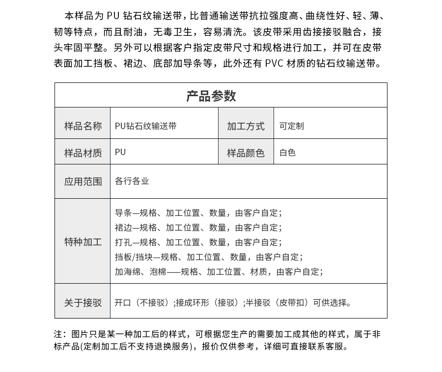 備注:餅干輸送帶圖片只是某一種加工后的樣式,可根據(jù)您生產(chǎn)的需要加工成其他的樣式,屬于非標(biāo)產(chǎn)品(定制加工后不支持退換服務(wù)),報價僅供參考,詳細(xì)可直接聯(lián)系客服。
