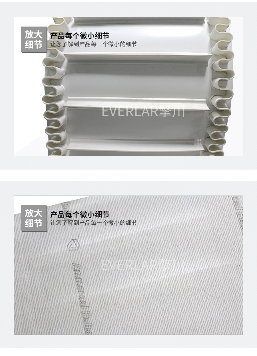 食品級輸送帶是EVERLA擎川主打產(chǎn)品之一。公司以其高科技的技術(shù)創(chuàng)新和全程控制的生產(chǎn)流程,制造出高品質(zhì)的食品輸送帶。該白色裙邊擋板食品輸送帶產(chǎn)品選用高強度優(yōu)質(zhì)聚酯織物作帶芯,帶體彈性好,不易變形,加上裙邊的設(shè)計使輸送的產(chǎn)品不易掉落。選用無污染聚氨酯或者聚氯乙烯制成白色、藍色或綠色,無污染、無異味。產(chǎn)品配方設(shè)計合理,符合衛(wèi)生指標,色澤適度,輕巧耐用。