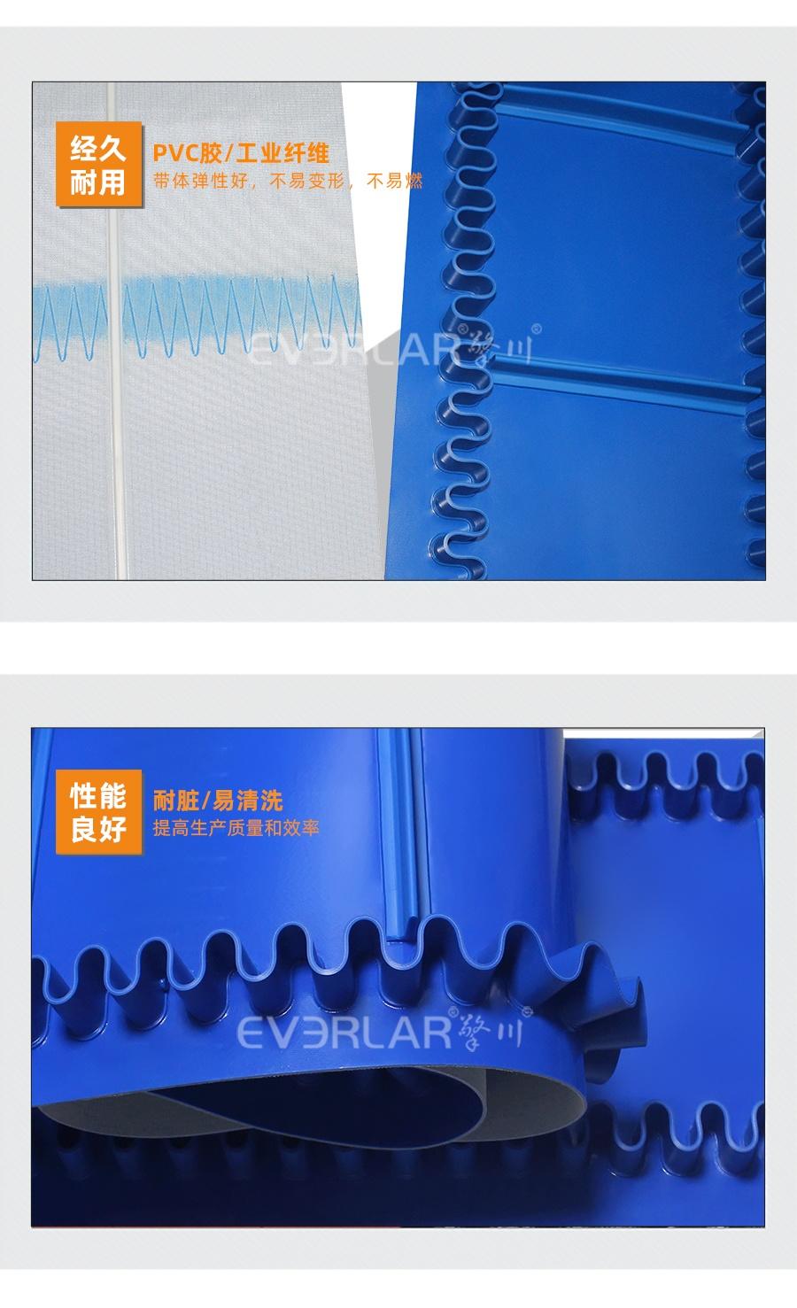 | 樣品名稱 | 藍色PVC輸送帶加擋板裙帶 | 加工方式 | 加擋板、加裙邊 |
