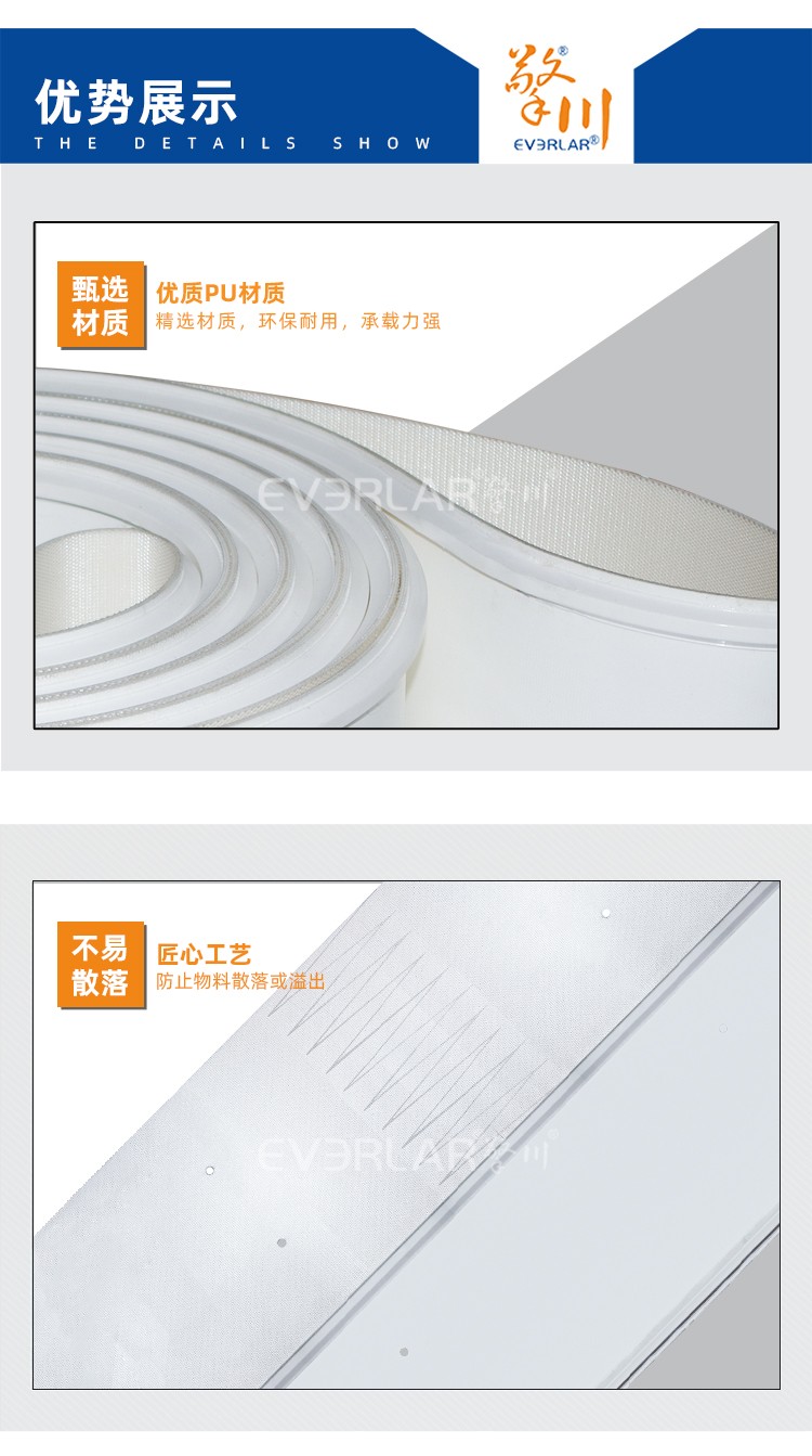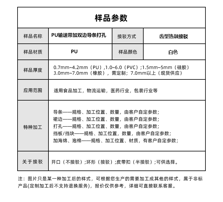 • 產(chǎn)品名稱:白色PU輸送帶加雙邊導(dǎo)條打孔耐磨耐油抗拉力強工業(yè)皮帶